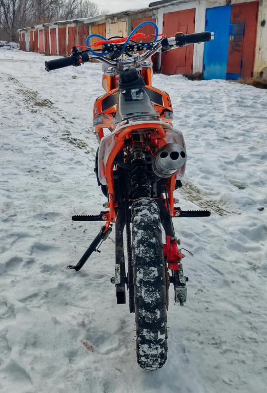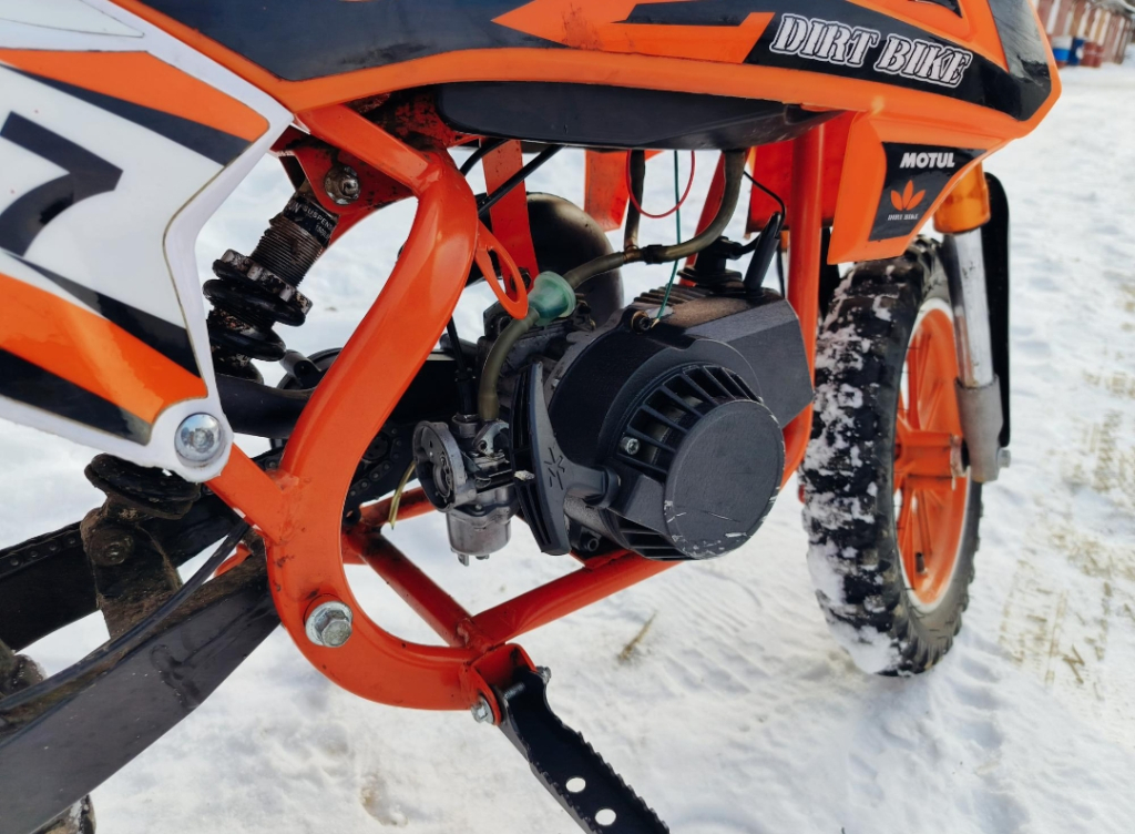 Двухтактный двигатель, 50куб, едет бодро, охлаждение воздушное, запуск с кикстартера, покрышки внедорожные (агрессивный протектор)